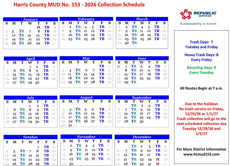 Trash collection days for the District are Tuesday and Friday. Trash should be placed in the Republic Services 95-gallon trash cart and placed at the curb by 7:00 a.m.